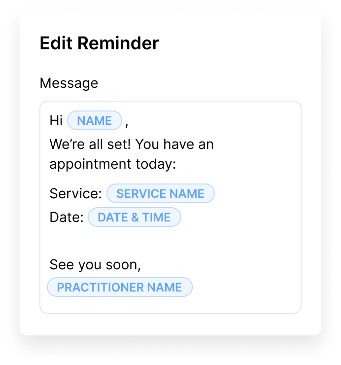 Create email reminders that sound like your clinic and include dynamic fields, like patient name and appointment date.