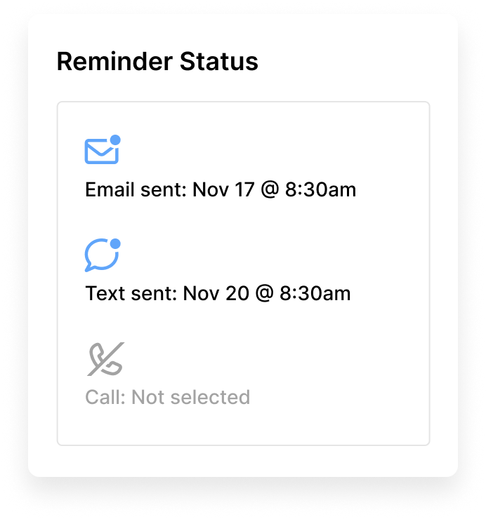 Email reminders work alongside SMS and phone reminders, ensuring patients receive updates through their preferred contact method.