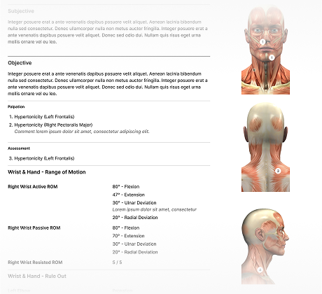 Assessments give you targeted inputs for observations, range of motion, tests, palpation, and more. They are conveniently placed into the Objective section of your SOAP Notes for better visibility.