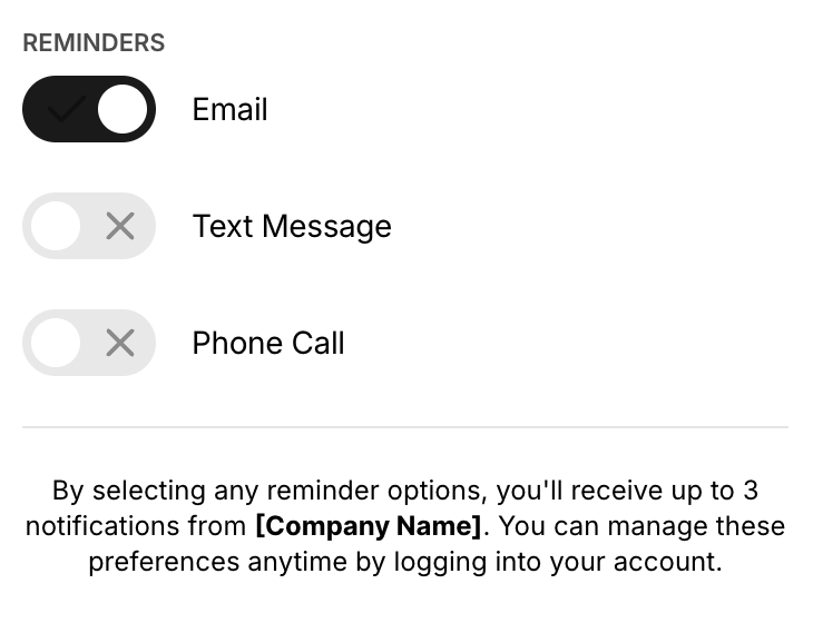 Managing your appointment reminders is easy. You can choose to receive reminders via SMS, phone call, or email, and you can customize these preferences when booking your appointment or at any time afterward through our portal. Opting into reminders is 100% optional and not a requirement to book the appointment.