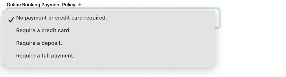 If connected with Square or Bambora, configure the payment policy; for example, it may require no payment upfront, credit card, or full payment.