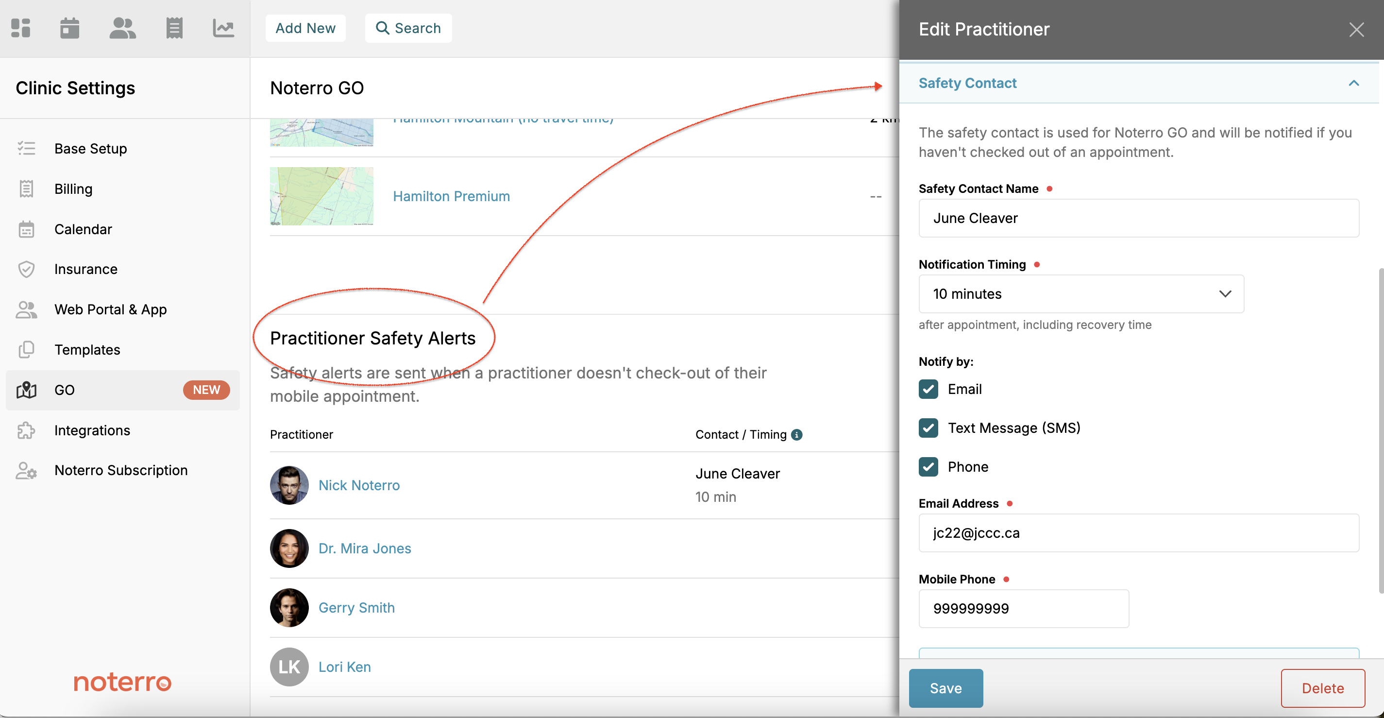 Edit Practitioner Profile: Open the practitioner profile and add a safety alert. This ensures your safety by sending an alert if you have not checked out of an appointment on time. Choose Alert Methods: Set the alert to notify you via email, SMS, or phone call if check-out is not completed after an appointment.